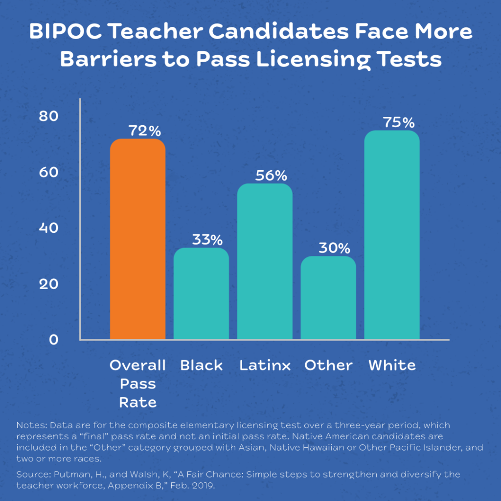 - Putman, H., and Walsh, K., “A Fair Chance: Simple Steps to Strengthen and Diversify the Teacher Workforce,” Feb. 2019. (including “Appendix B: Estimated number of candidates by state and race/ethnicity who cannot earn a license.”)