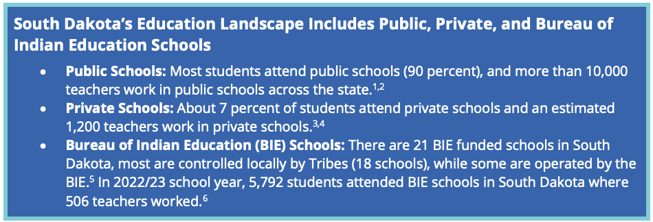 South Dakota’s education landscape is made up of public, private, and Bureau of Indian Education (BIE) schools. All schools face staffing challenges, although the nuances are unique given differences in funding, other requirements, and student makeup. In total, more than 11,000 educators work to teach young people in all corners of the state. Students across all school settings share the same need for stable, well-prepared teachers who understand their communities.
