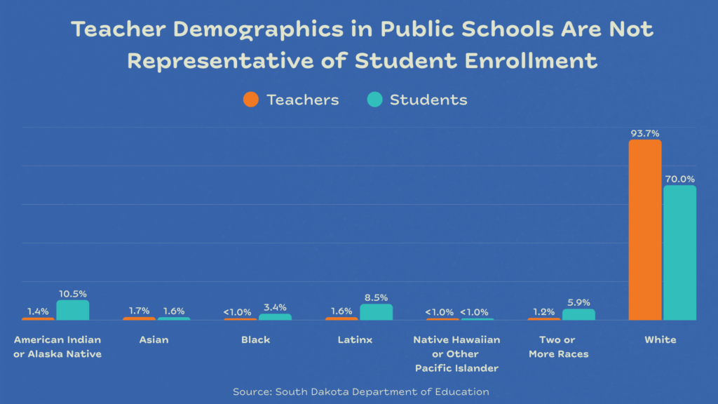 Public schools face challenges hiring a diverse teaching workforce, and current teacher demographics are not representative of student enrollment. Only 1.4 percent of teachers in South Dakota are Native American, yet Native American students make up 10 percent of public school enrollment. Similar disparities exist for Black, Latinx, and multiracial teachers.15 This mismatch limits students’ access to role models who share their lived experiences and reduces opportunities for culturally responsive teaching. Comparable demographic data is limited for private and BIE schools, making it more difficult to fully assess representation across all education settings.