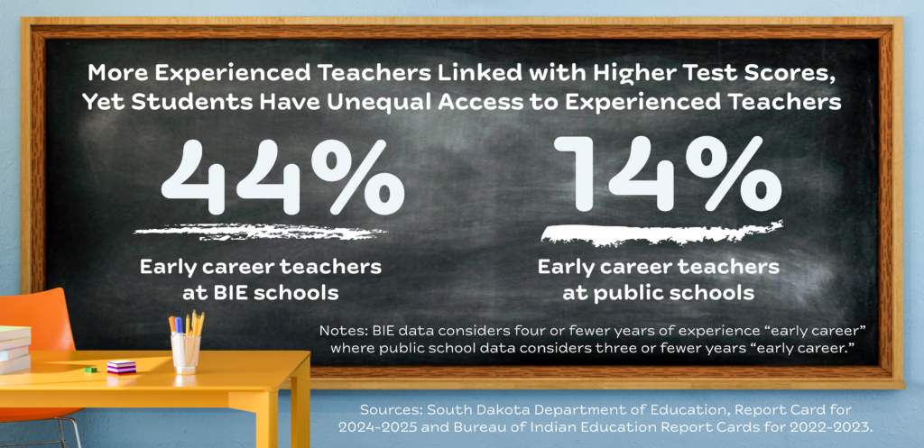 - South Dakota Department of Education, combined analysis using data from: “South Dakota Public District Instructional Staff,” 2024-25; “2024-25 Fall Enrollment Census Count, Public - by School, Race/Ethnicity, and Grade Level”; and “2024-25 Rural Schools.” Data was matched by district and grouped by whether student population was greater than or equal to 25 percent American Indian and whether a school was classified as rural or not.